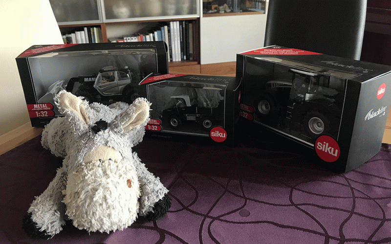 Aber es soll ja hier nicht um mich gehen, sondern um die schwarzen Schönheiten hinter mir. Die alle zwei Jahre stattfindende Agrotechnik ist vorbei, und Herrchen hat natürlich gleich zugeschlagen. Alle drei Blackline-Sondermodelle von Siku sind schon bei uns angekommen. Ich werde jetzt gleich mal beaufsichtigen, wie die in die Sondermodell-Vitrine gepackt werden.