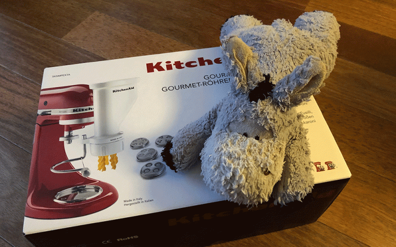 Frauchen hat sich ein neues Zubehörteil für Ihr Lieblings-Küchen-Gerät gekauft, jetzt können wir endlich richtig coole italienische Röhren-Nudeln selbst machen. Mniami, ich bekomme schon Hunger!